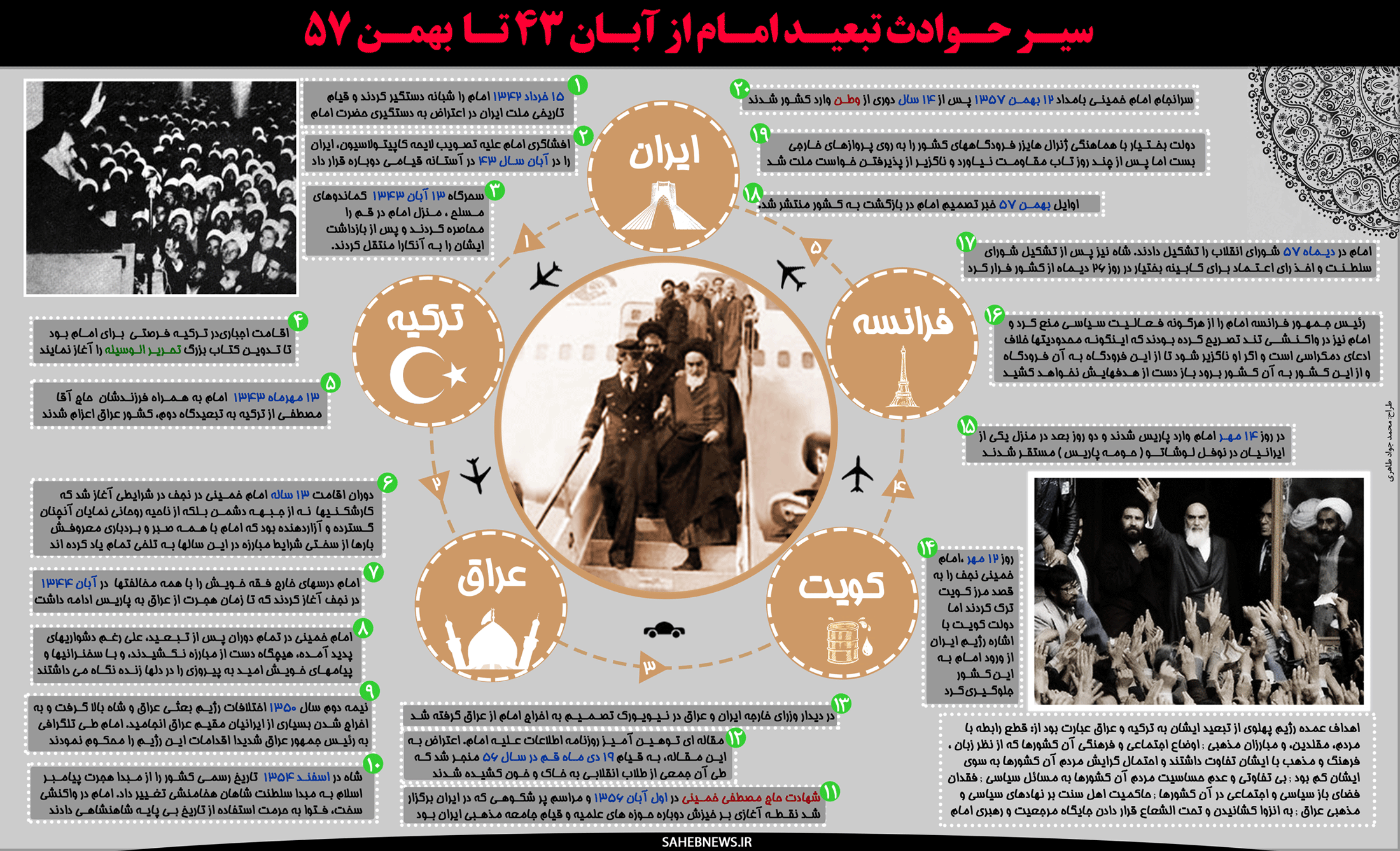 اینفوگرافیک سیر حوادث تبعید امام از آبان 43 تا آبان 57